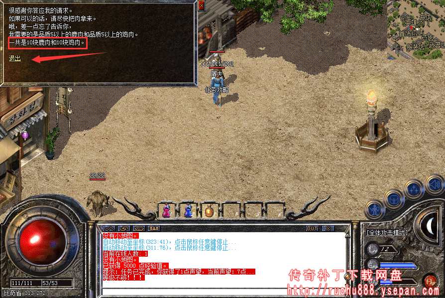 找来 NPC 需要的鹿肉和鸡肉各10块,交付任务。